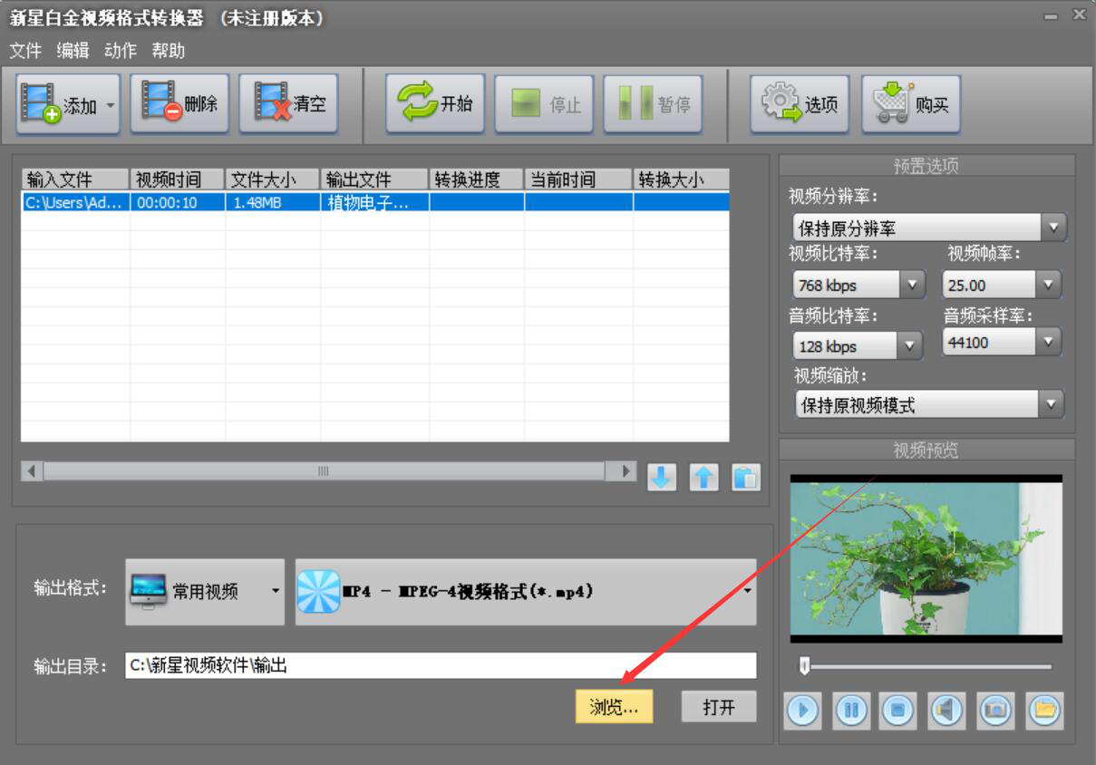 4、如果AVI转换成MP4后的视频文件输出目录需要更改,就点击新星白金视频格式转换器界面中的“浏览”按钮。