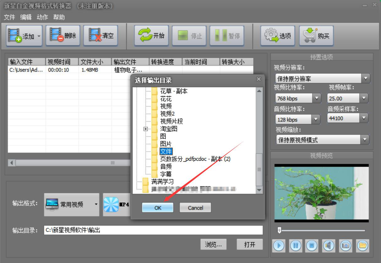 5、此时,新星白金视频格式转换器便会弹出选择目录窗口,我们选择AVI转换成MP4后的视频保存路径,再点击“OK”按钮。
