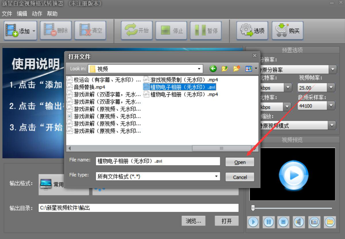 2、然后,在弹出的窗口中,我们选择需要转换成MP4的AVI视频文件,并点击“打开”按钮,将其导入新星白金视频格式转换器。