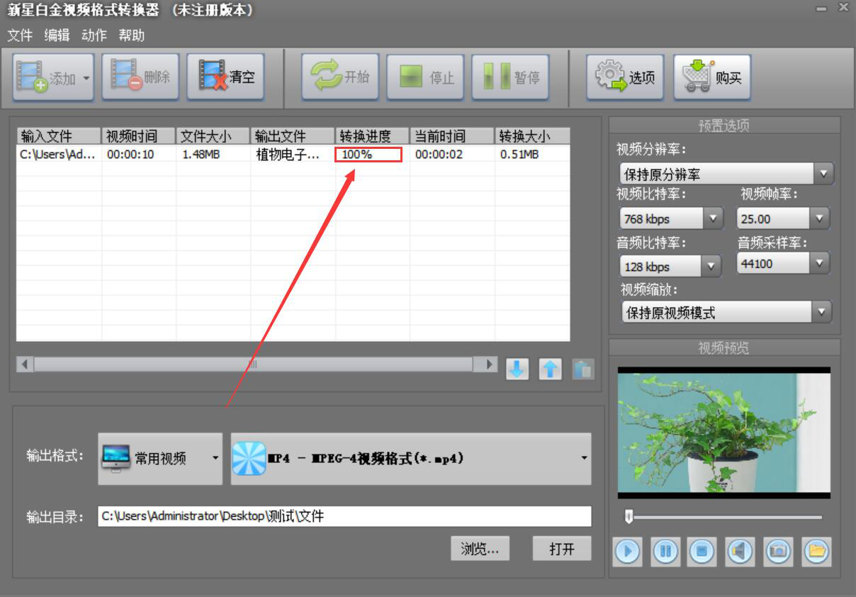 7、最后,转换进度显示100%,说明新星白金视频格式转换器成功地将AVI转换成MP4了。