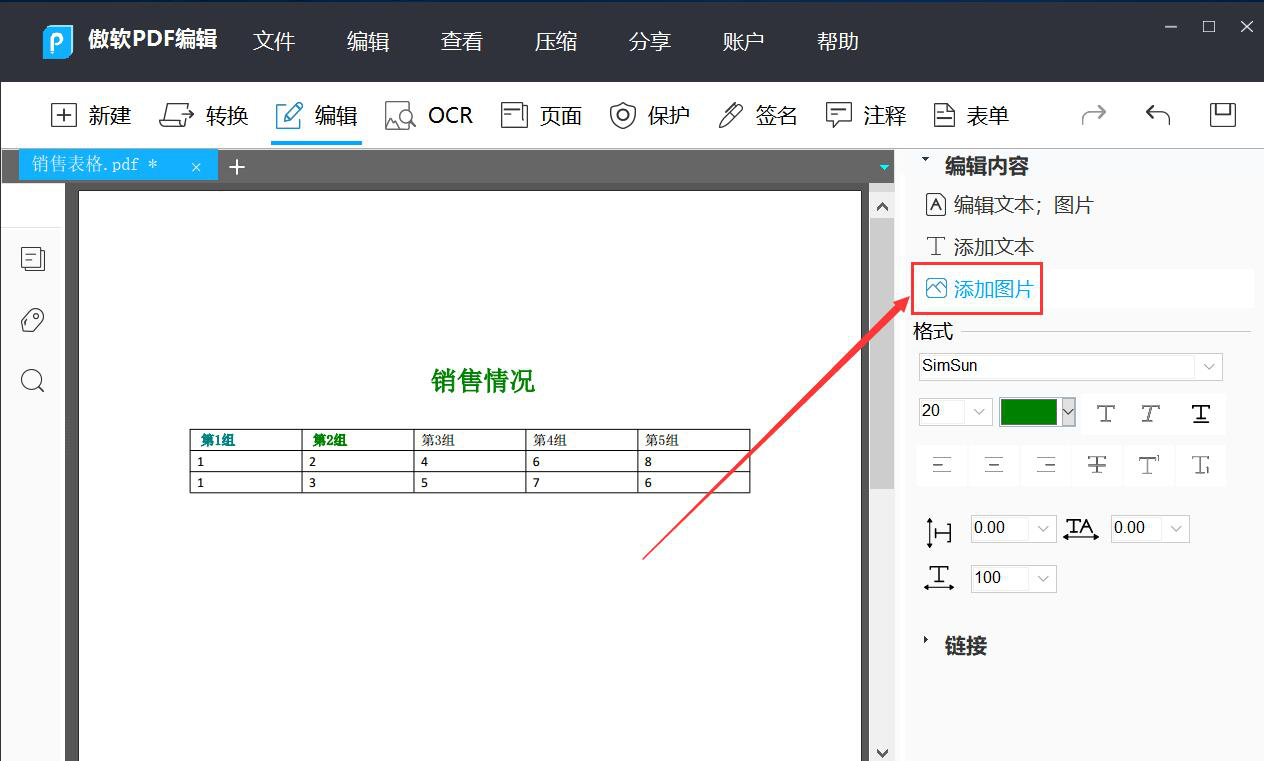 7、如果在编辑PDF文件时,想要添加图片,就可以点击傲软PDF编辑软件中的“添加图片”按钮。