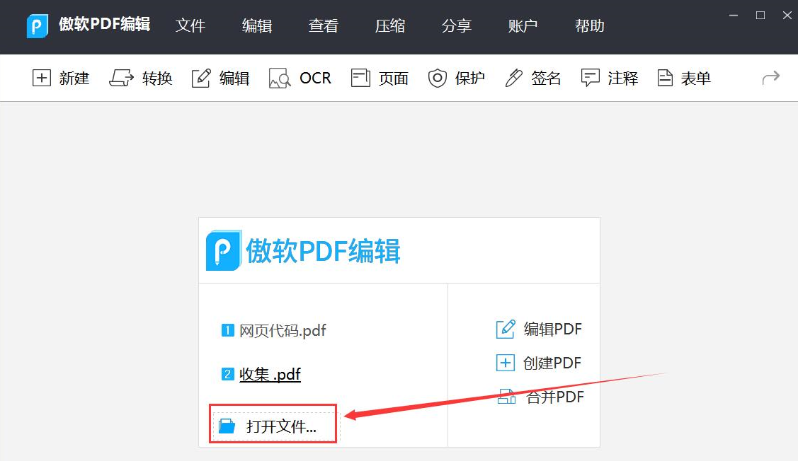 1、首先,我们打开傲软PDF编辑软件,点击如下图的“打开文件”按钮。