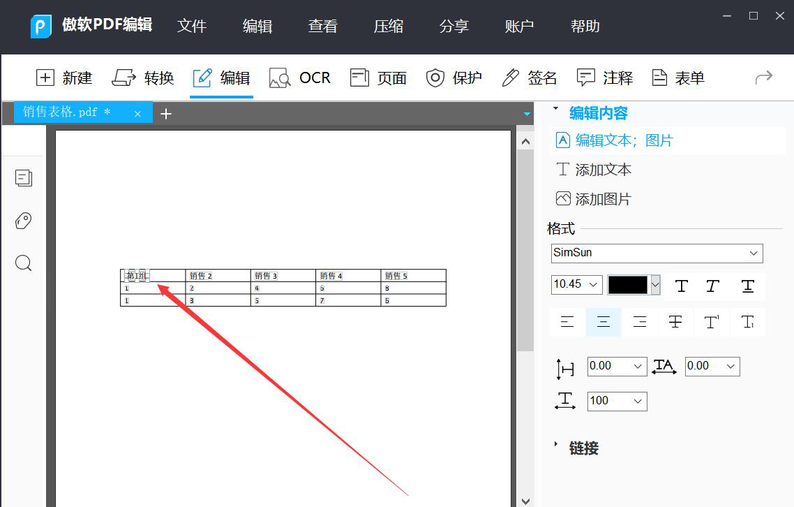 4、在傲软PDF编辑软件的编辑区域,我们鼠标双击需要编辑的PDF文件内容,直接修改为自己想要的文字内容即可。