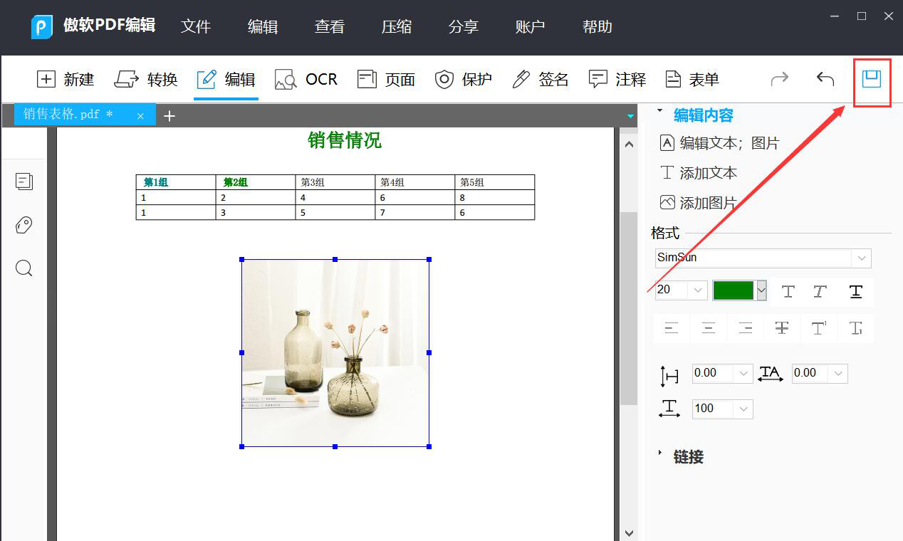 9、回到傲软PDF编辑软件的编辑界面,鼠标左键单击确定图片摆放的位置,如下图。如果不需要再编辑PDF文件,就点击界面右上方的“保存”按钮,将PDF文件保存起来。