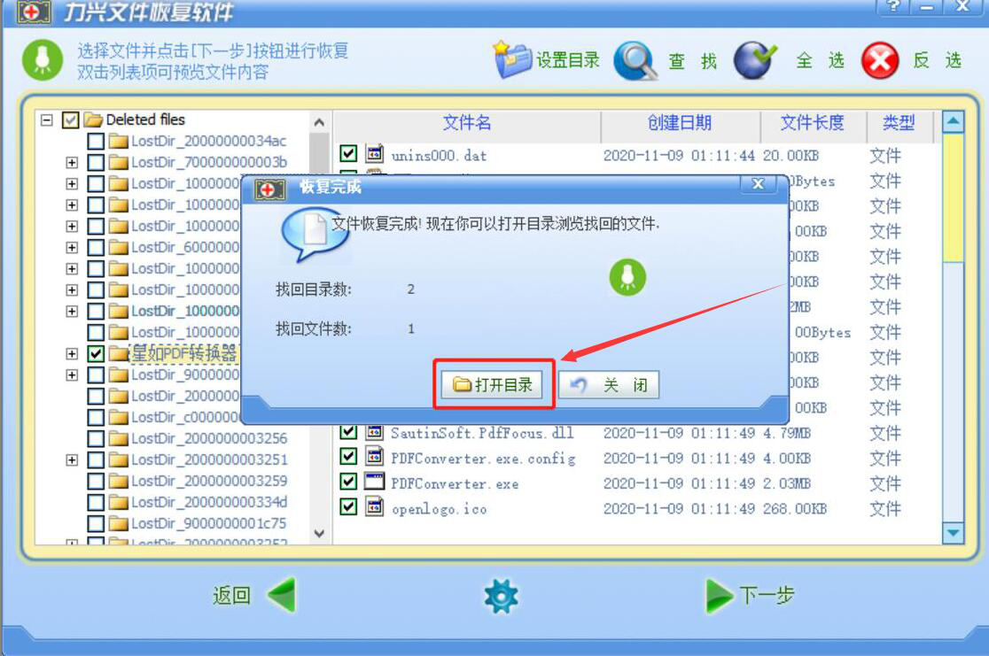 9、最后,弹出恢复完成的窗口提示,说明力兴文件恢复软件成功地将删除的文件给找回来了,我们点击“打开目录”按钮,即可快速打开恢复后的文件。