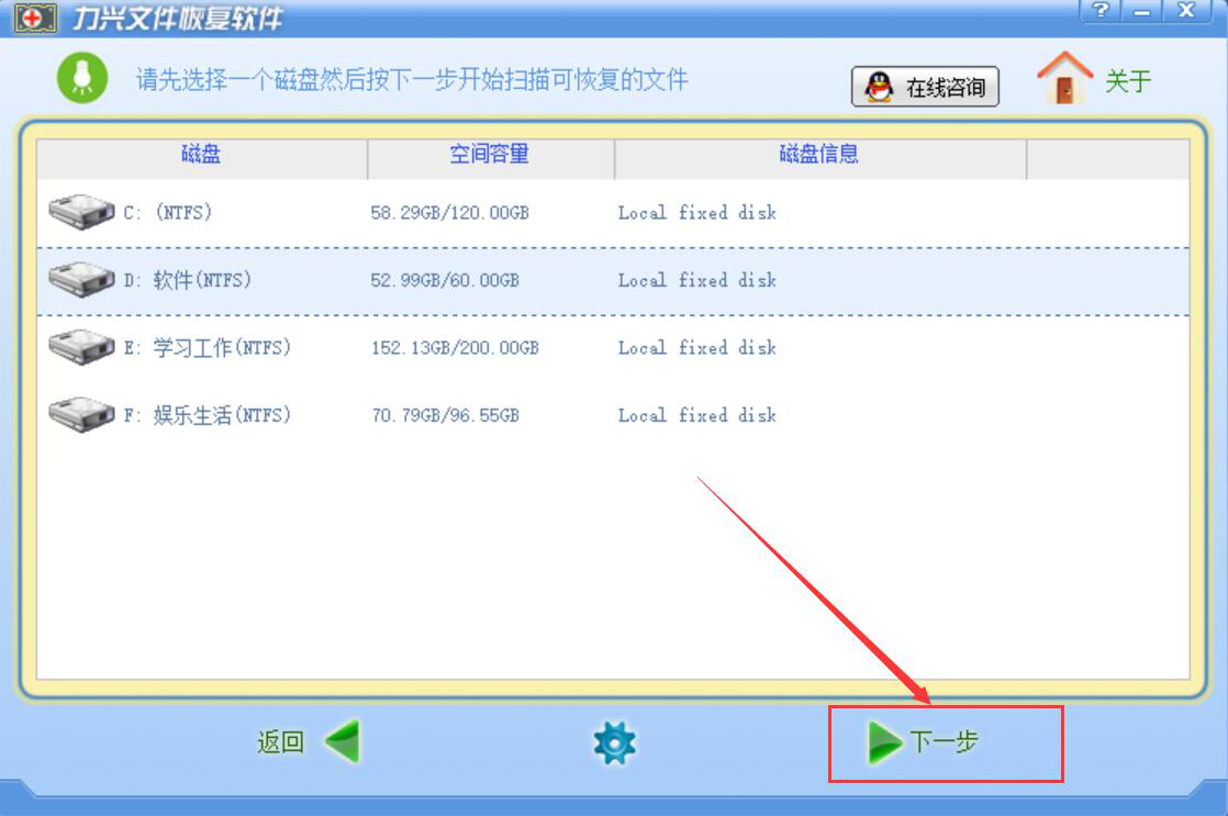 1、首先,我们打开力兴文件恢复软件,选择自己想要恢复的已经删除的文件,它之前所保存的磁盘,再点击“下一步”按钮。