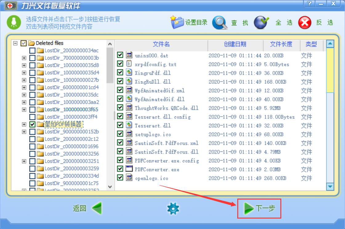 8、我们勾选自己想要恢复的删除文件,再点击“下一步”按钮,力兴文件恢复软件便开始恢复删除的文件。