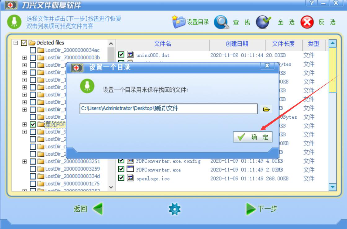 6、此时,力兴文件恢复软件便会弹出如下窗口,我们选择删除的文件恢复后的保存路径,再点击“确定”按钮。