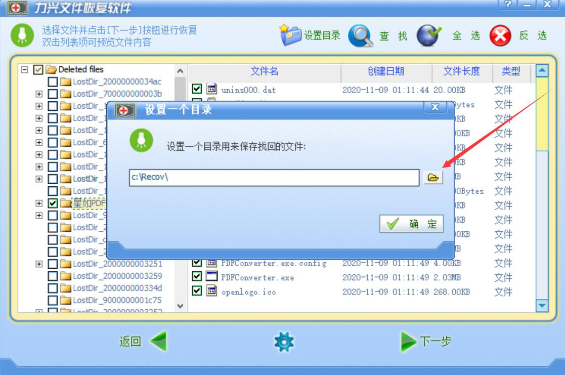 5、在力兴文件恢复软件弹出的设置一个目录窗口中,我们点击文件夹图标按钮,设置目录来保存恢复的文件。
