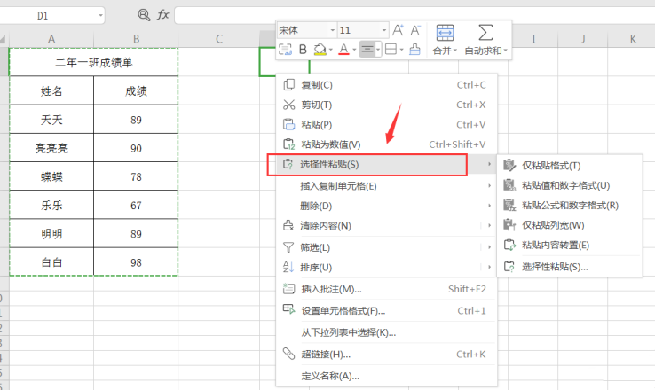 选择任意一个空白单元格,点击鼠标右键,弹出菜单,点击【选择性粘贴】——【选择性粘贴】,