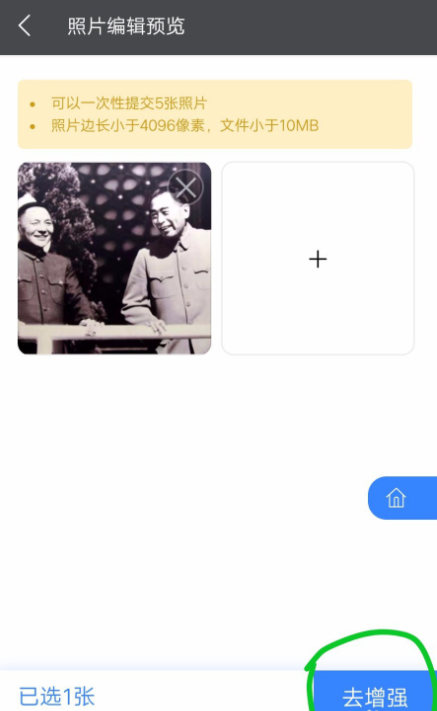 如图,点击【开始增强】,添加需要处理的照片,可以一次性提交5张照片,点击下方的【去增强】,软件即可自动修复照片,