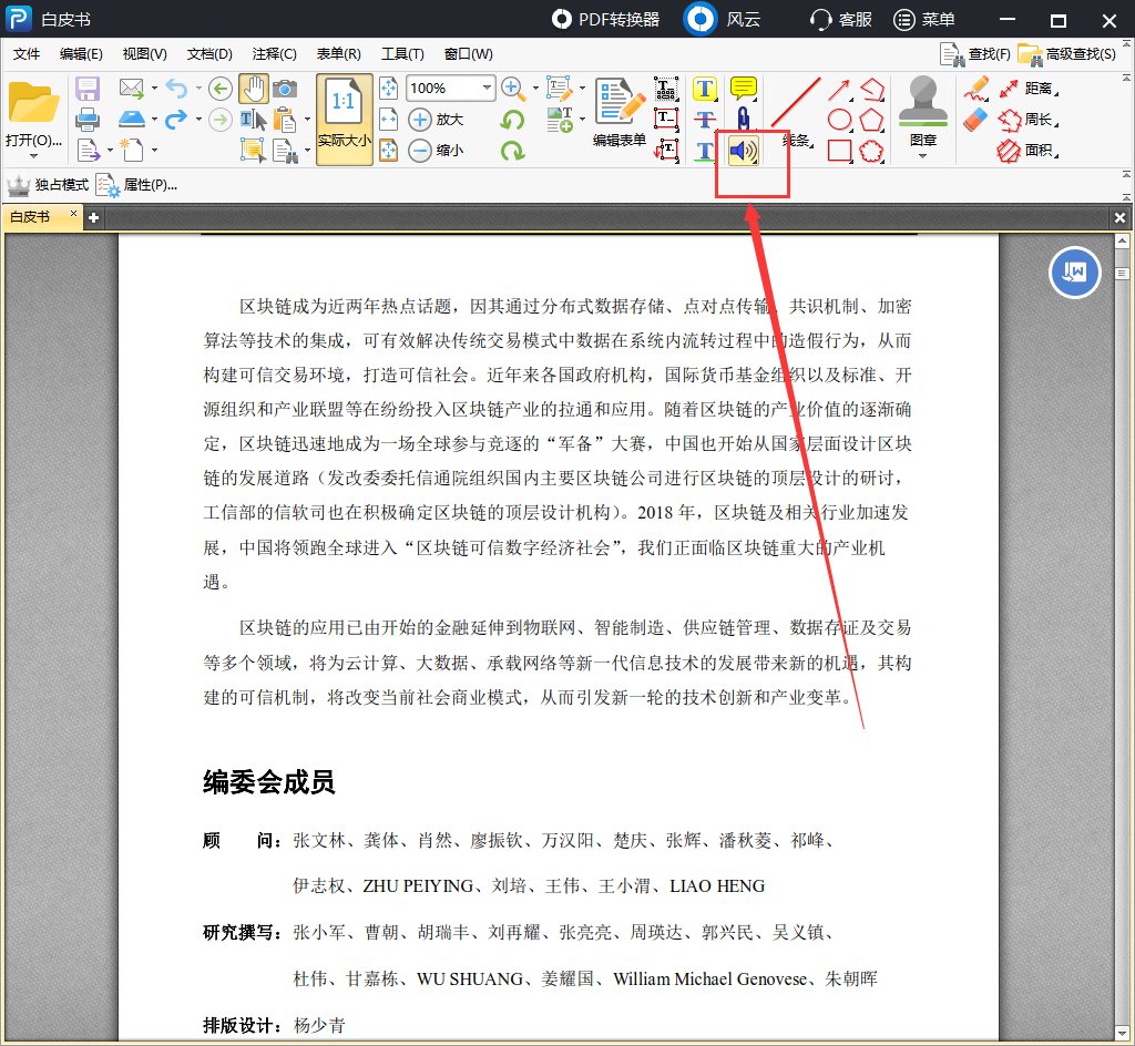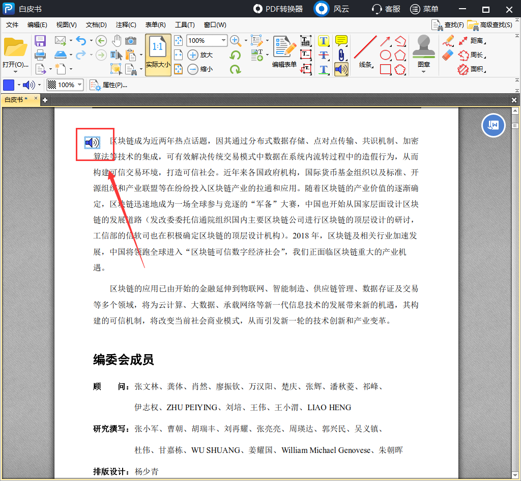 声音附件添加之后,PDF文档页面就会出现一个小喇叭,如图,你可以移动喇叭所在位置,点击喇叭,就会播放附件内容。