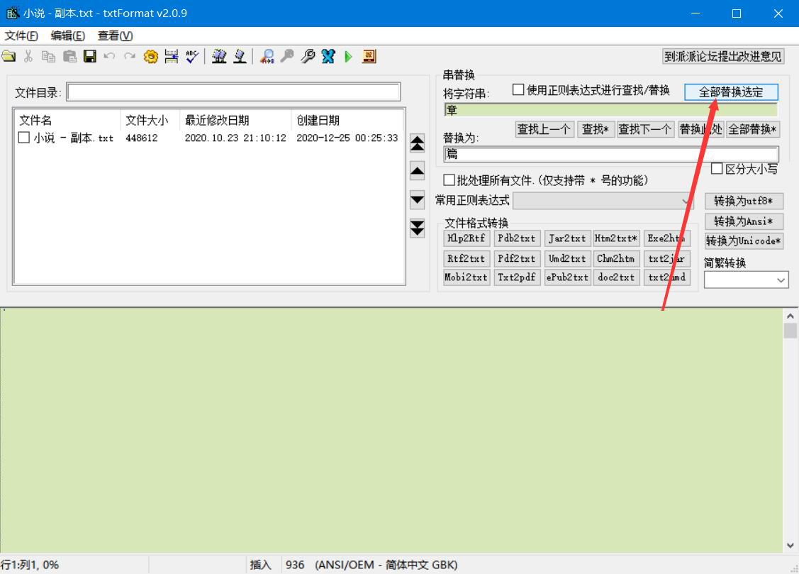 4、txt文档内容替换前后的文字都输入完成后,我们点击界面右上方的“全部替换选定”按钮,txtFormat便开始替换txt文档内容。