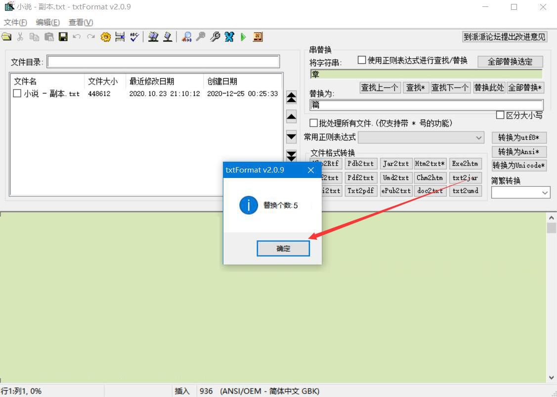 5、最后,弹出如下图窗口,显示替换个数,说明txtFormat成功地替换了txt文档内容,直接点击“确定”按钮即可。
