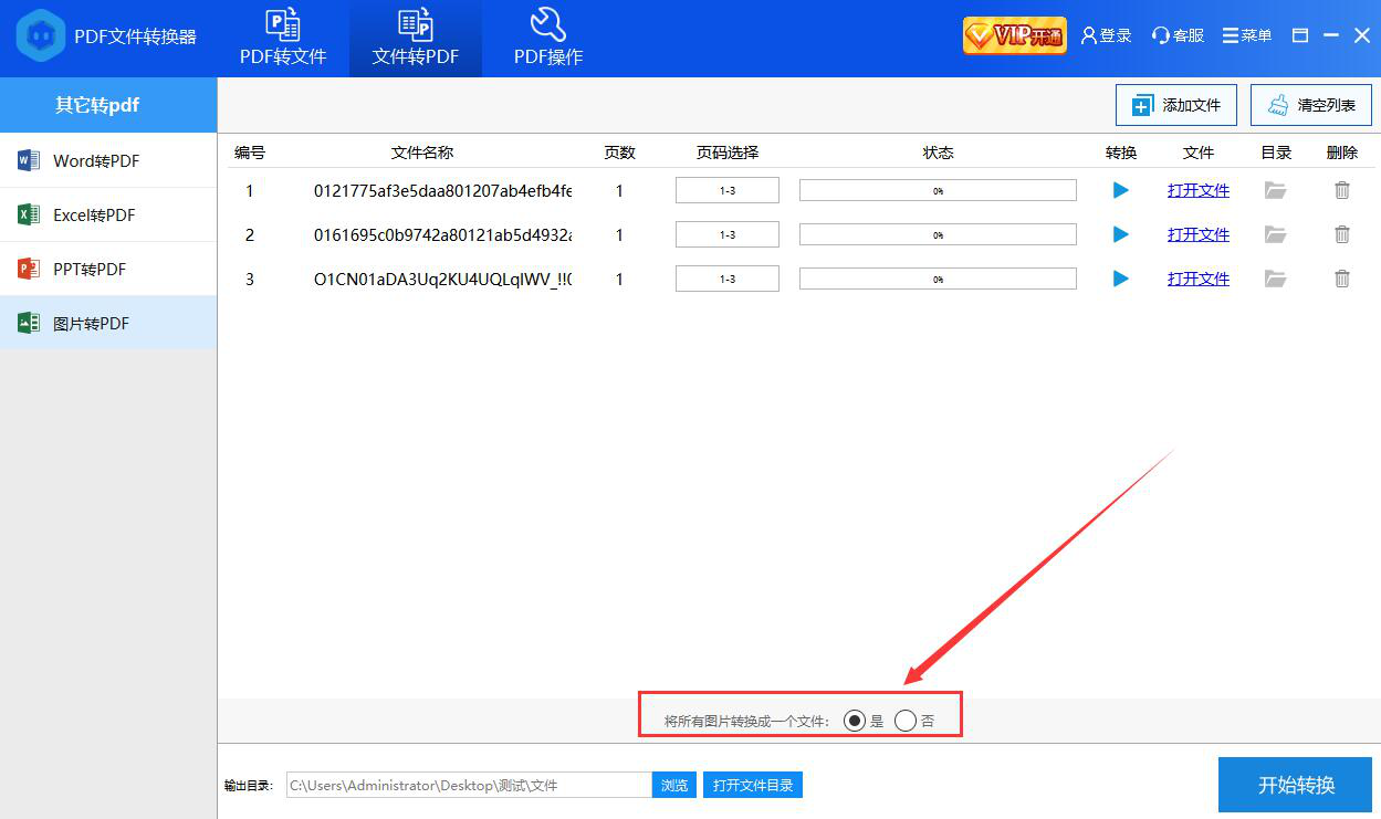 3、接下来,我们回到彩虹猪PDF转换器操作界面,根据自己的需要选择是否将所有图片转换成一个PDF文件。