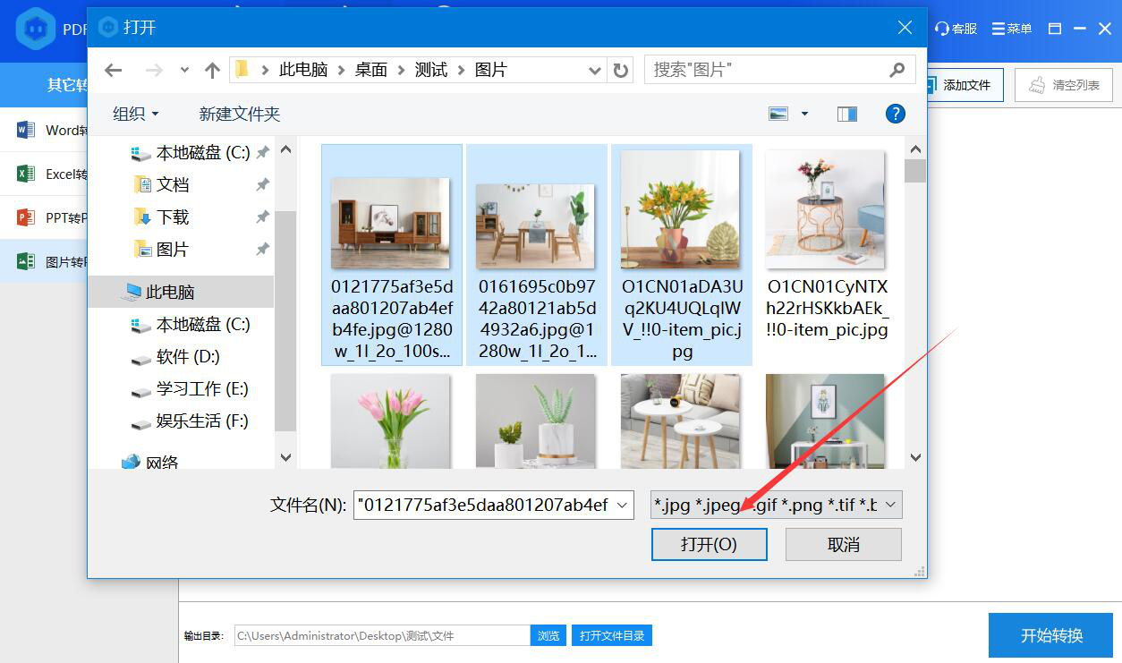 2、然后,在弹出的窗口中,我们将需要转换为PDF的图片一并选中,再点击“打开”按钮,将其导入彩虹猪PDF转换器。