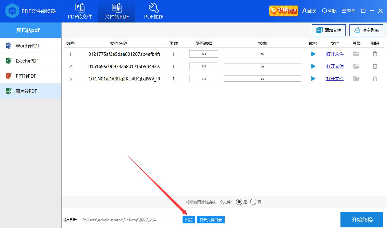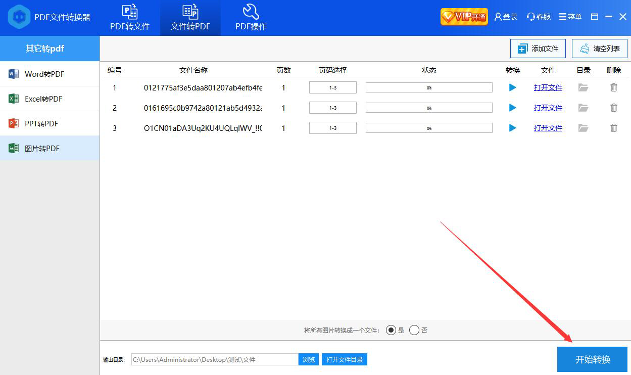 6、输出目录设置好了,我们点击界面右下方的“开始转换”按钮,彩虹猪PDF转换器便开始将图片转换成PDF。
