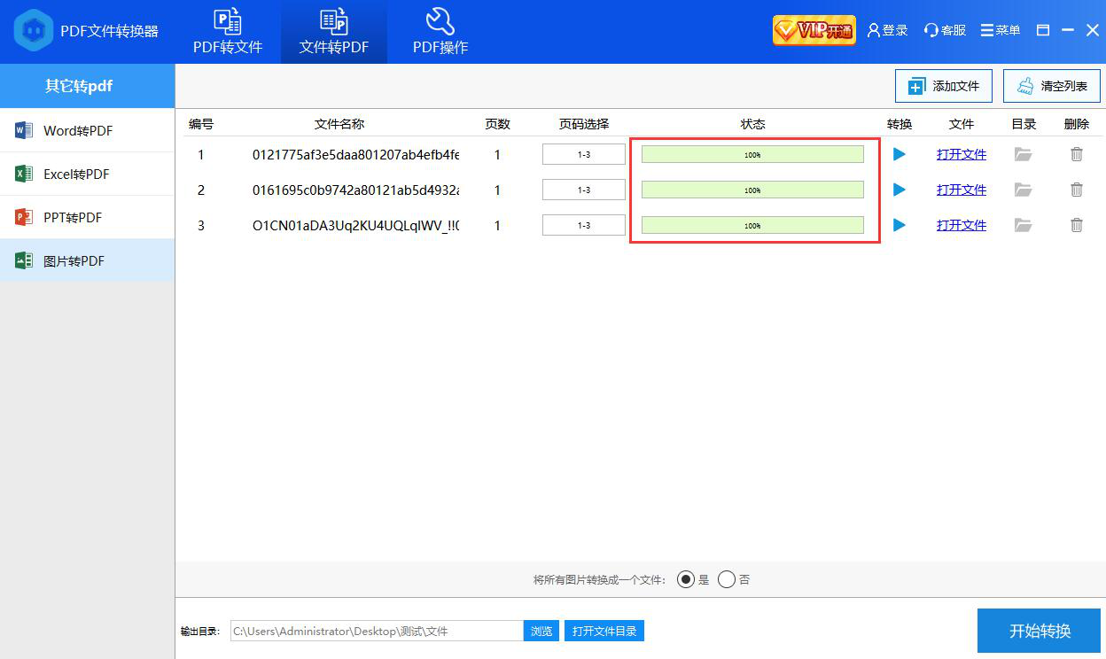 7、最后,当每一张图片的状态都显示为100%时,则说明彩虹猪PDF转换器成功地将图片转换成PDF文件了。