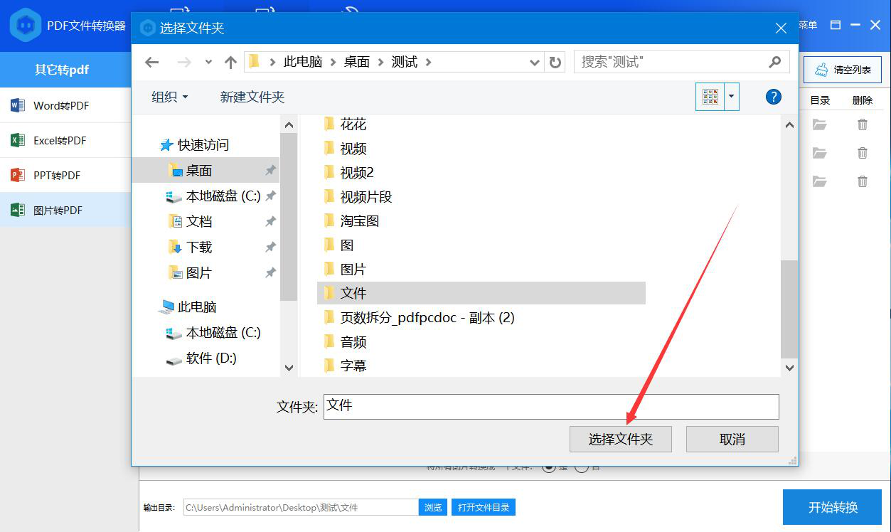 5、此时,彩虹猪PDF转换器会弹出选择文件夹窗口。我们选择图片转换成PDF文件后的保存目录,再点击“选择文件夹”按钮。