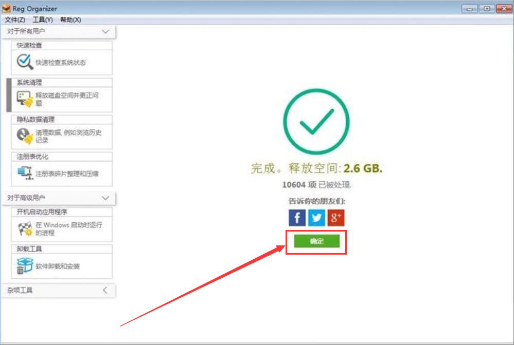 5、最后,Reg Organizer清理系统垃圾完毕,可以看到释放的空间容量,我们点击“确定”按钮即可。