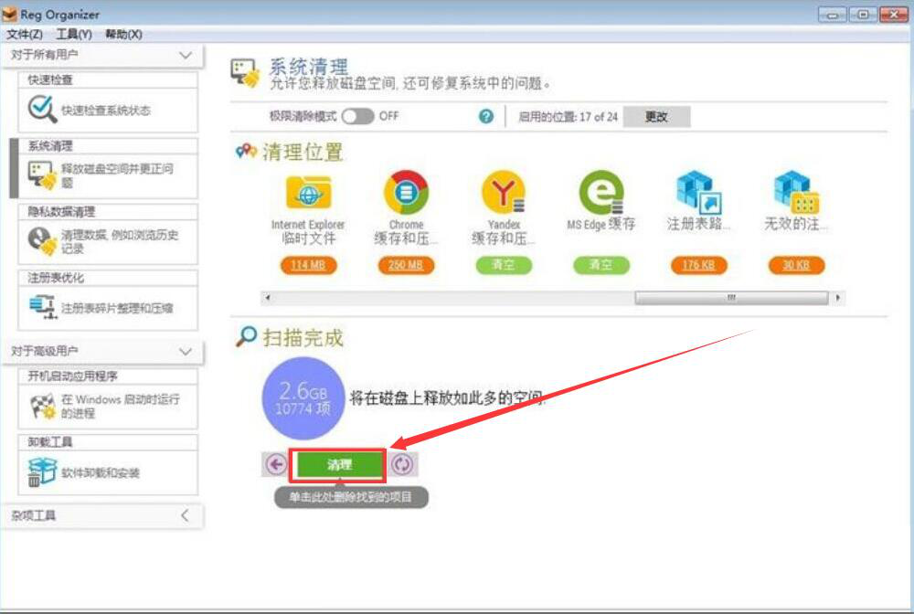 3、接下来,扫描完成,我们点击“清理”按钮,Reg Organizer便开始清理系统垃圾。
