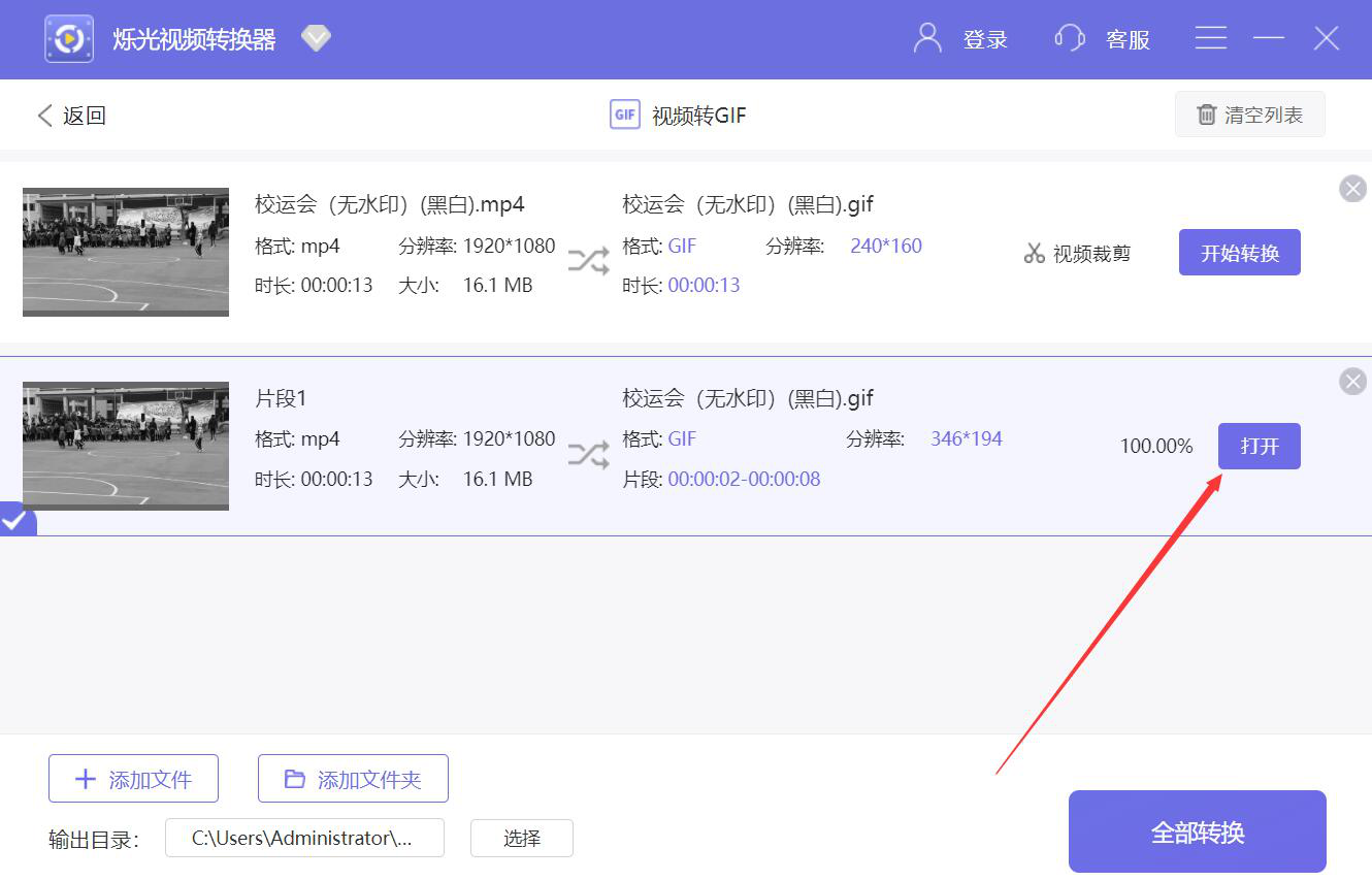 9、最后,视频中进度显示100%,说明烁光视频转换器成功地将视频转换为GIF了。我们点击“打开”按钮,即可观看自己做好的GIF动图了。