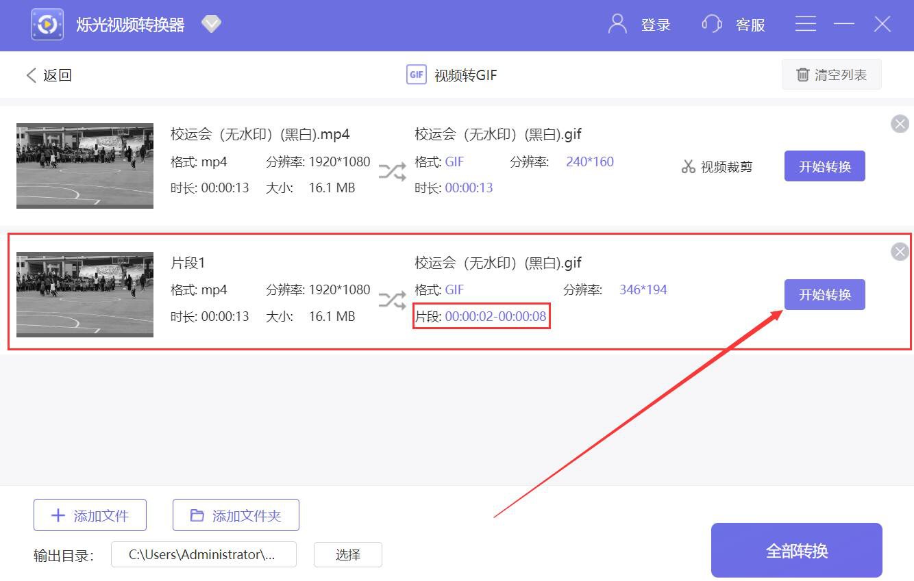 8、接着,回到烁光视频转换器主操作界面,我们在刚才剪切好的视频片段中,点击“开始转换”按钮,烁光视频转换器便开始将该视频片段转换为GIF。