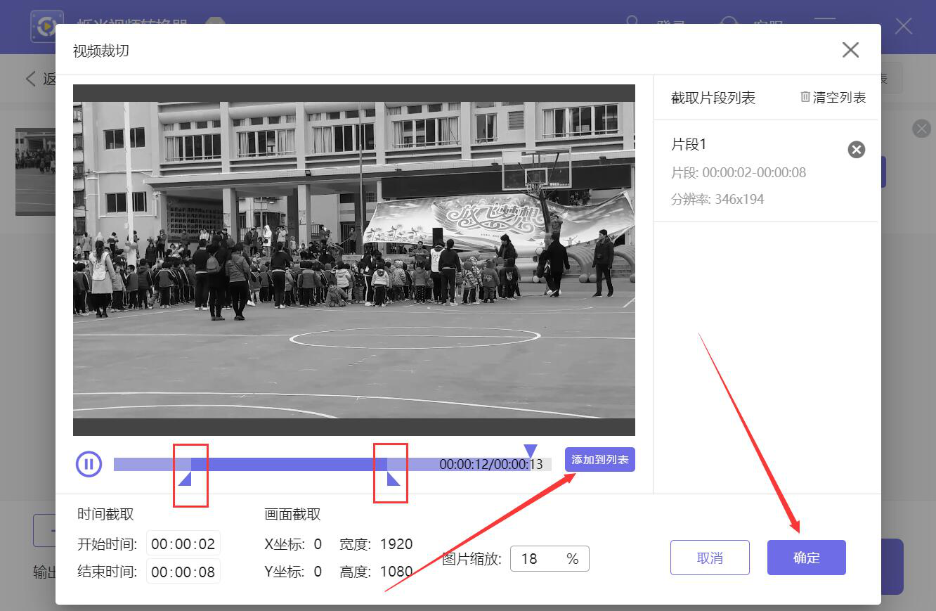 7、在视频剪切界面中,我们用鼠标左键移动视频下方的滑块,选取需要转换为GIF的视频片段,再点击“添加到列表”按钮,将其加载至截取片段列表,再点击“确定”按钮。