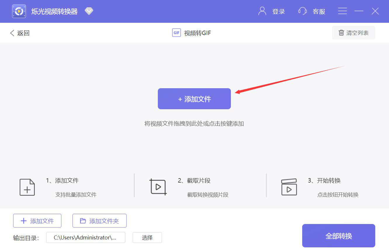 2、进入烁光视频转换器的视频转GIF操作界面,我们点击“+添加文件”按钮。