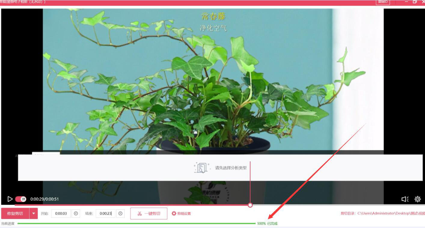 7、最后,进度显示“100%已完成”,说明小葫芦直播录制助手成功地剪切了视频。它默认的保存路径是源文件路径。