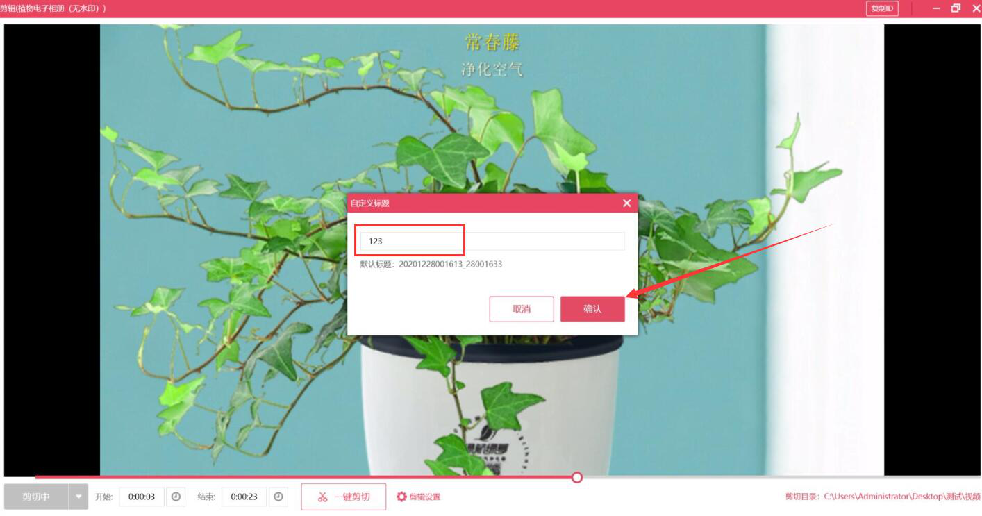 6、此时,小葫芦直播录制助手便会弹出自定义标题窗口,我们输入视频剪切的文件名称,再点击“确认”按钮。