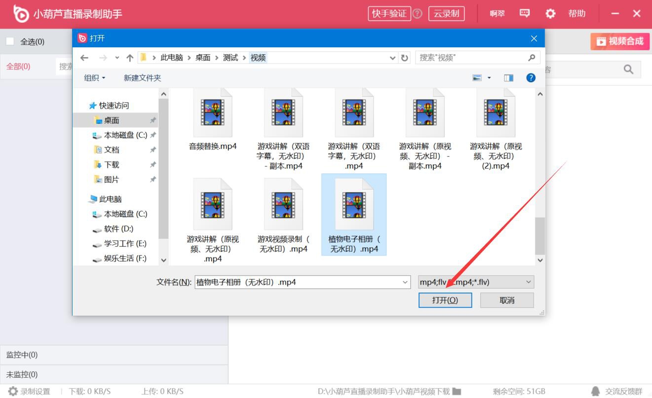 2、在弹出的窗口中,我们选择需要剪切的视频,并点击“打开”按钮,将其导入小葫芦直播录制助手。