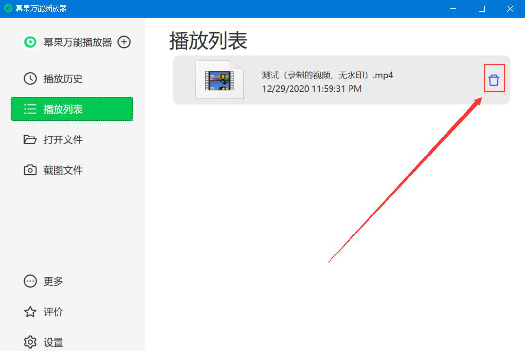 5.如果想将幂果万能播放器的播放列表中的某个音视频删掉,就可以移动鼠标至该视频上方,点击如下图的垃圾桶图标按钮即可删除该音视频。