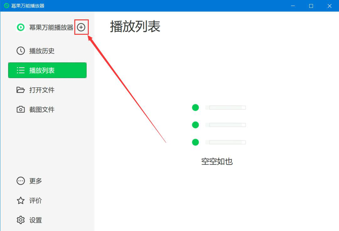 1、首先,我们打开幂果万能播放器,点击界面左上方的“+”按钮。