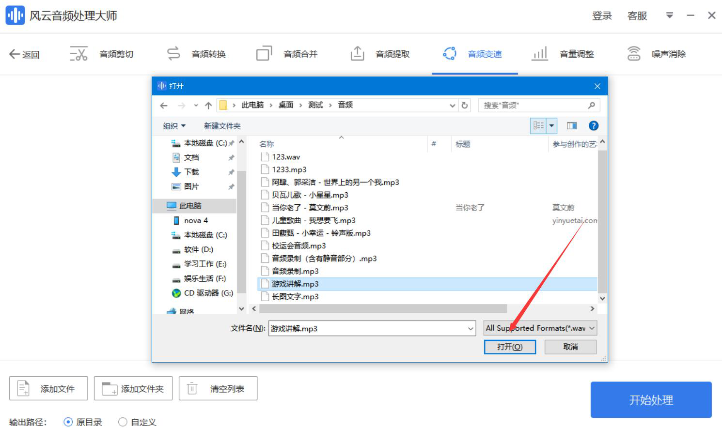 3、在弹出的窗口中,我们选择需要调整播放速度的音频,并点击“打开”按钮,将其导入风云音频处理大师。