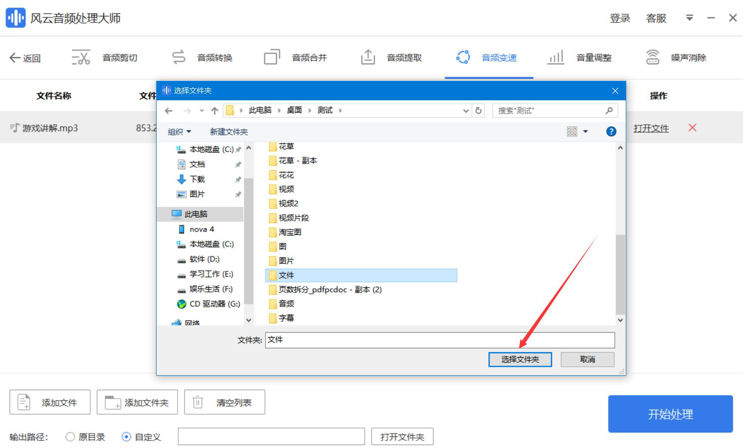 6、此时,风云音频处理大师便会弹出路径设置窗口,我们选择调整了播放速度后的音频保存路径,再点击“选择文件夹”按钮。