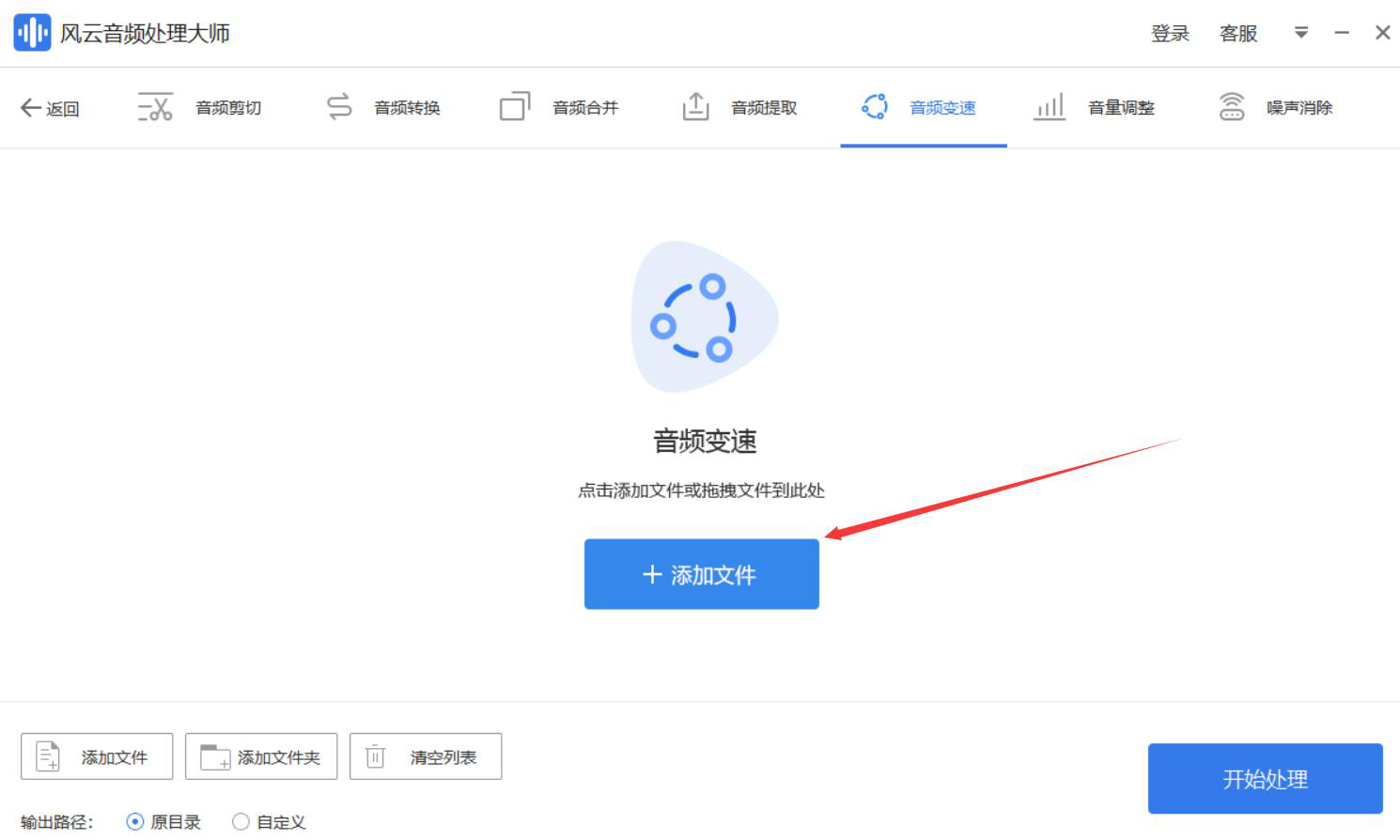 2、然后,进入风云音频处理大师的音频变速操作界面,我们点击“+添加文件”按钮。