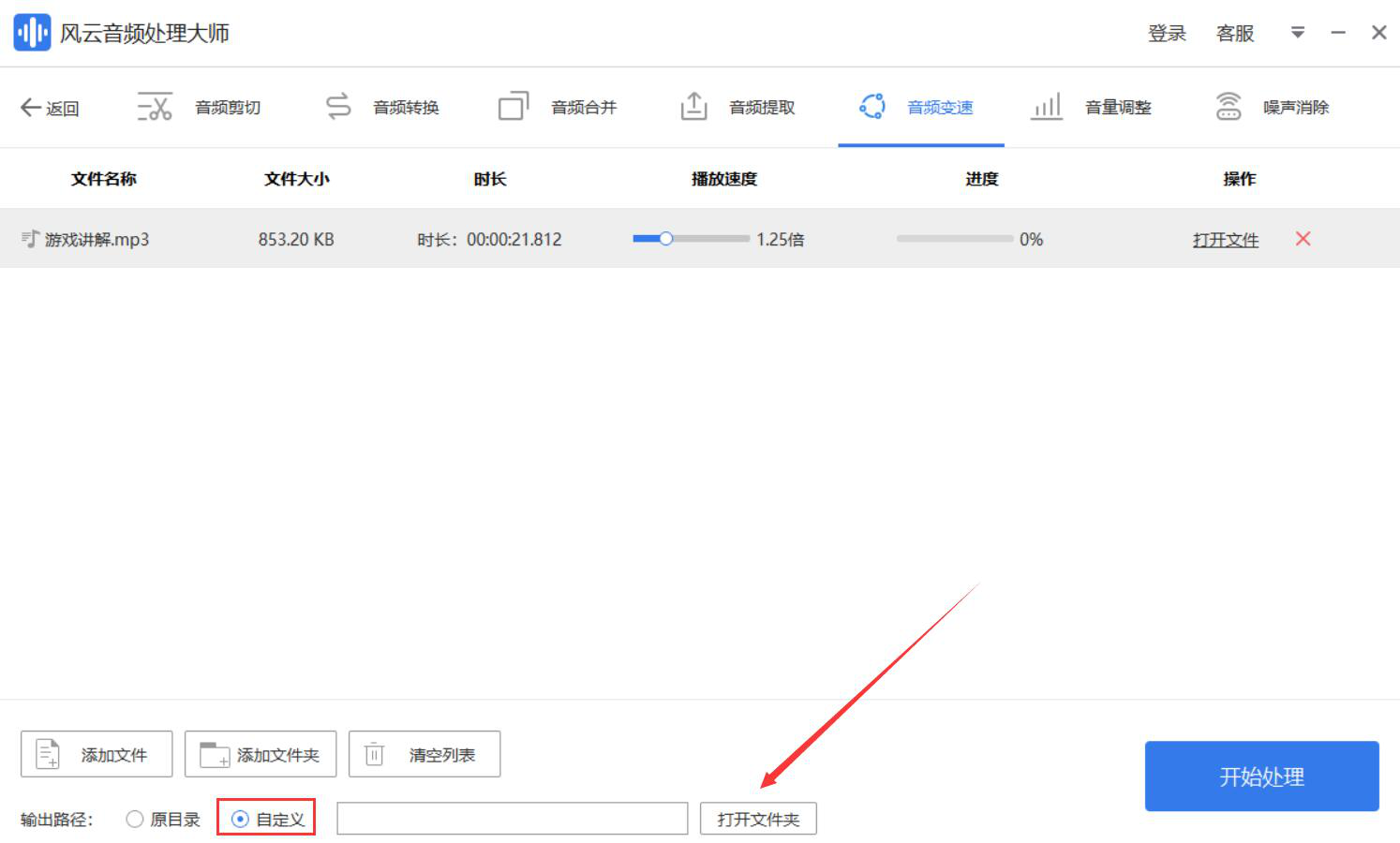 5、如果调整了播放速度的音频输出路径需要更改,就点击风云音频处理大师界面中的“自定义”和它旁边的“打开文件夹”按钮。