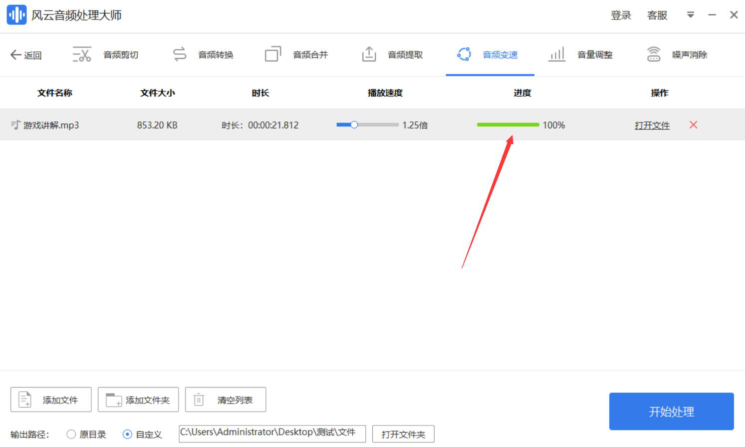 8、最后,当进度显示100%时,则说明风云音频处理大师成功地调整了音频的播放速度。