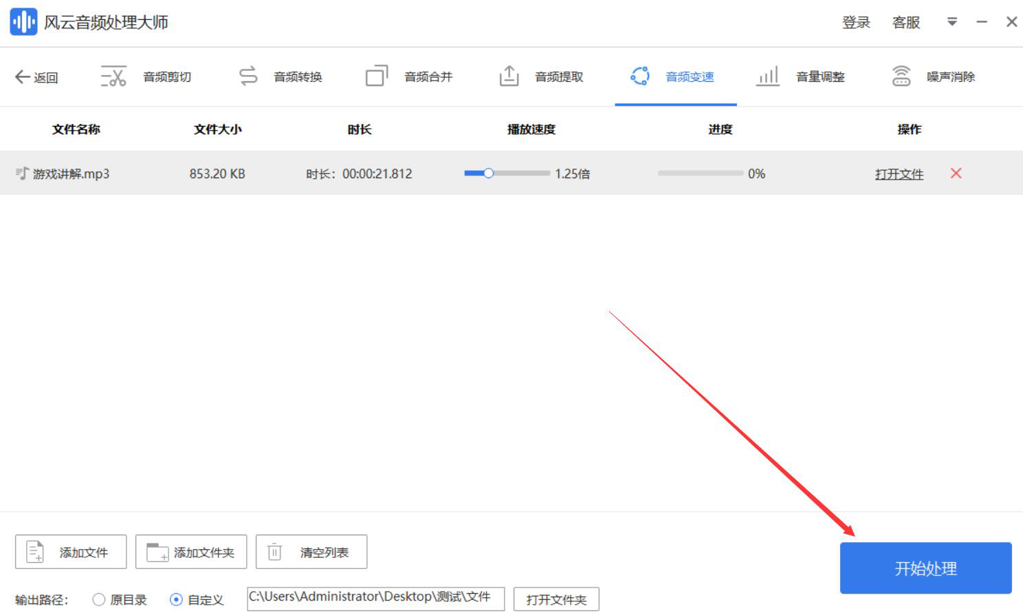 7、最后,我们点击界面右下方的“开始处理”按钮,风云音频处理大师便开始执行调整音频播放速度的命令。