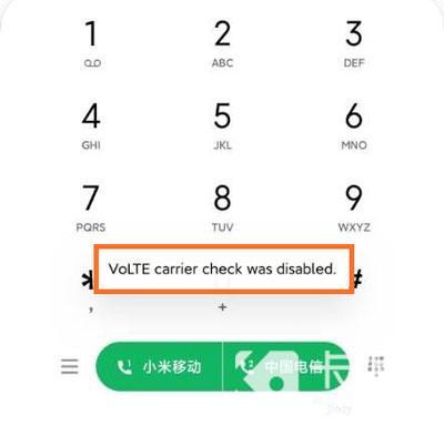 8.打开小米11手机自带的【电话】,在拨号页面输入【*#*#86583#*#*】代码,看到【Volte carrier check was disabled】就表示已经开启Volte了,再也不会弹出“volte未注册”提示。