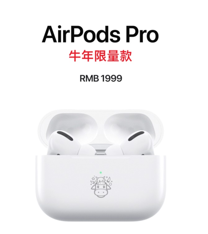 苹果官方牛年限量款 AirPods Pro 在 Apple Store 零售店和 Apple Store 在线商店发售,限量 25400 副,其中 Apple Store 零售店 11480 副,Apple Store 在线商店 13920 副。每位顾客限购两副。苹果官方同时公布,AirPods Pro 牛年限量款零售价为人民币 1999 元。
