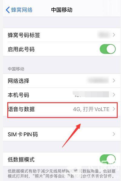 4、点击进入对应号码网络设置之后,点击下方的【语音与数据】,可以看到当前使用的是4G网络;