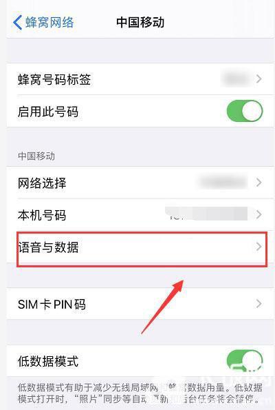 4、点击进入设置后,选择下方的【语音与数据】设置;