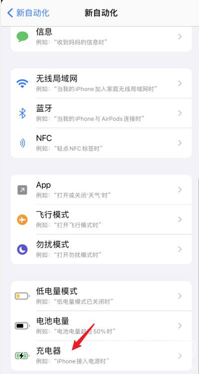 6、进入创建类型选择页面后,往上滑动找到最下方的【充电器】;