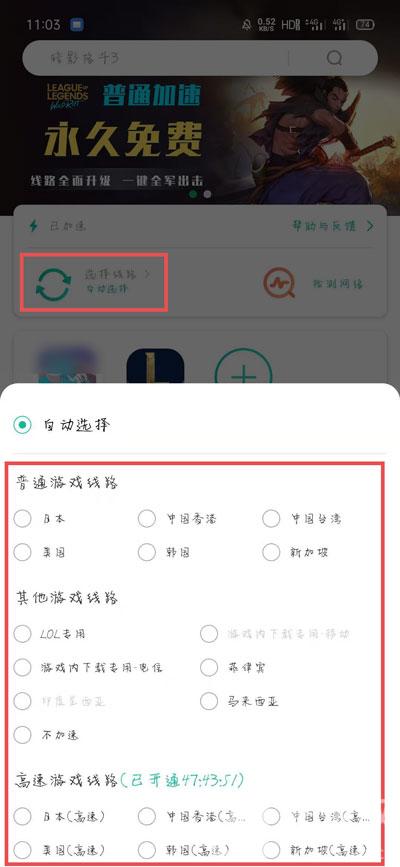 5、点击启动后即可为英雄联盟手游开启加速,正常体验游戏,如果出现网络延迟、卡顿等情况,可选择切换路线。