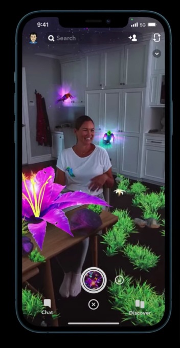 6、在 Snapchat 应用程序中,通过 AR 镜头,你可以看到花草覆盖在桌子和地板上,鸟儿朝你脸上飞去。房间后面的草看上去像是离得更远了,植物爬上了厨房的橱柜。镜头中的鸟儿会消失,他们可以移动到人的身后,或者视野之外,甚至精确地落在人的手中。