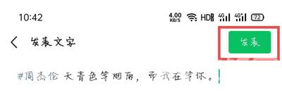 5、添加好话题标签后,点击右上角的【发表】发布朋友圈;