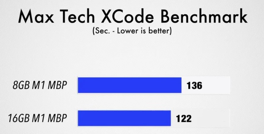 在一项模拟编译代码的 Max Tech Xcode 基准测试中,16GB 机型的得分为 122 分,而 8GB 机型的得分为 136 分,得分越低越好。