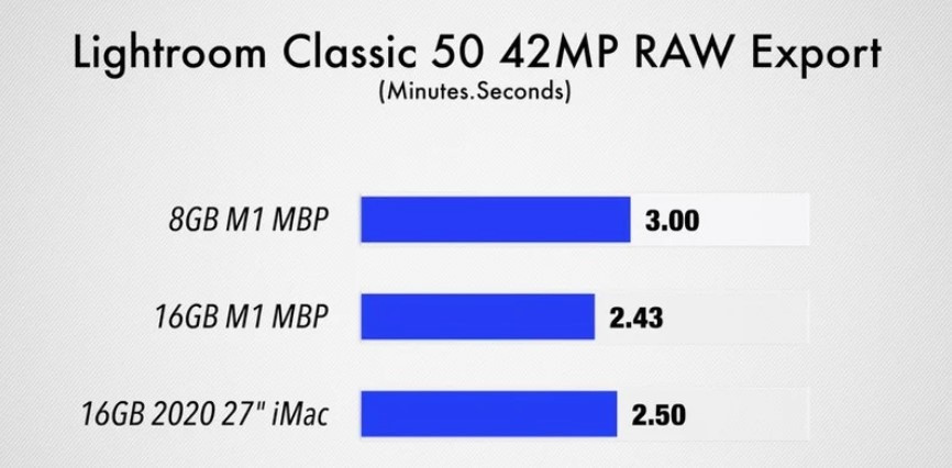在 4K 导出测试和 Lightroom Classic RAW 导出测试中也出现了小的差异,但结果相当接近,差别只有 17 秒。16GB 机型甚至击败了 2300 美元的 iMac。